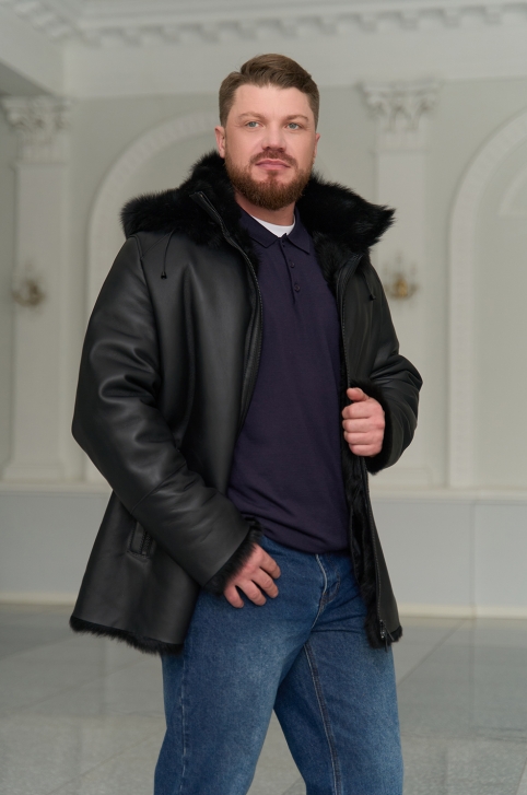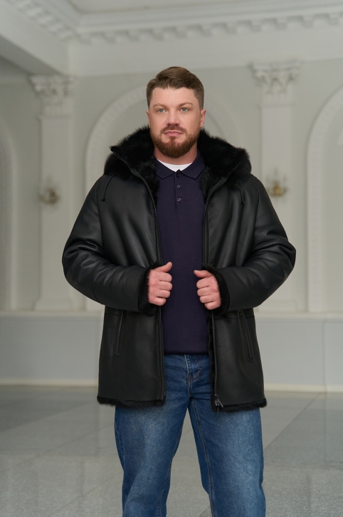 Мужская дубленка черного цвета с капюшоном - № 31792