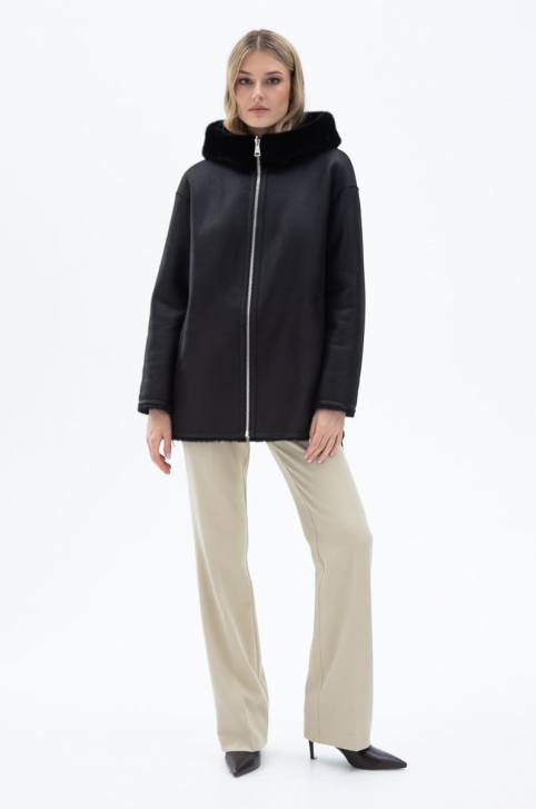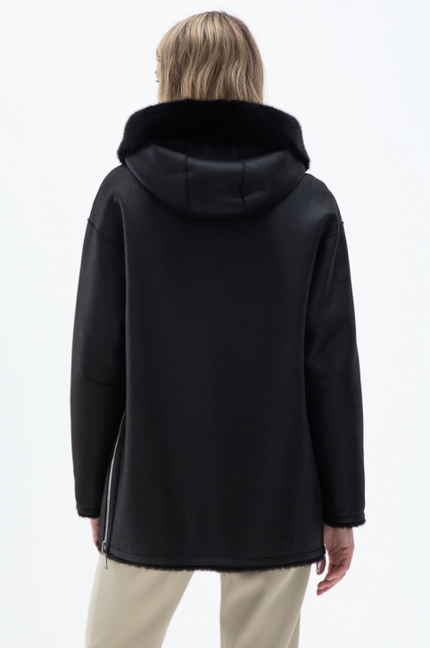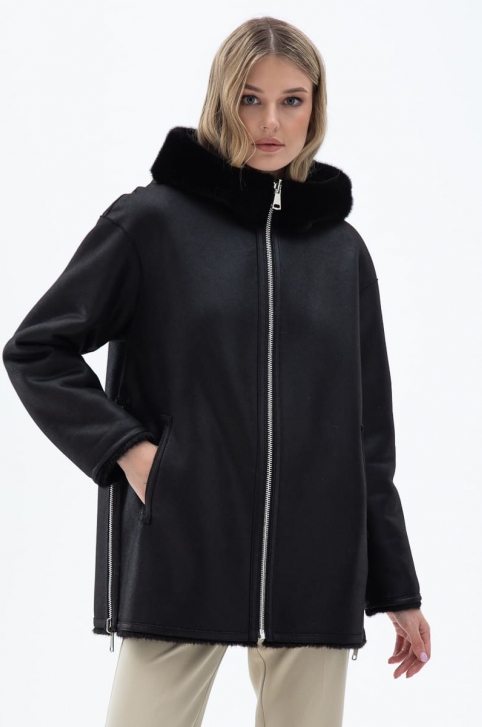 Женская двухсторонняя дубленка из эко кожи с капюшоном