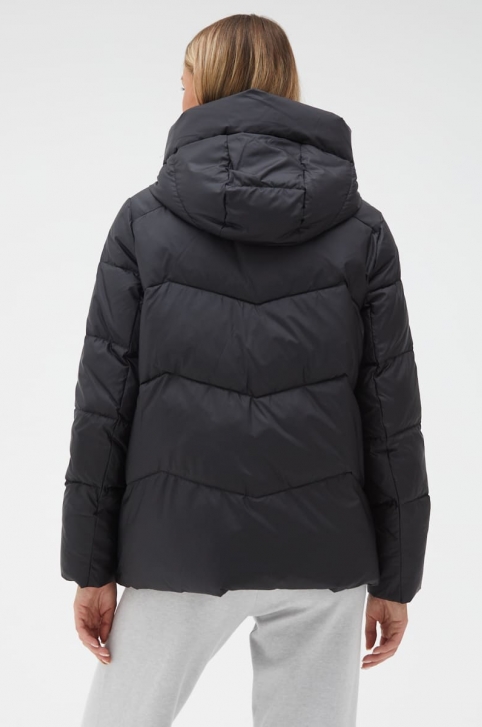 Женский пуховик черного цвета с капюшоном