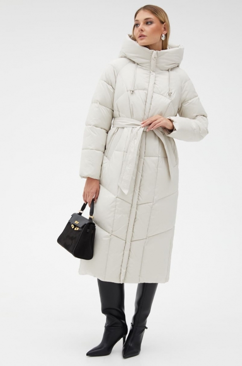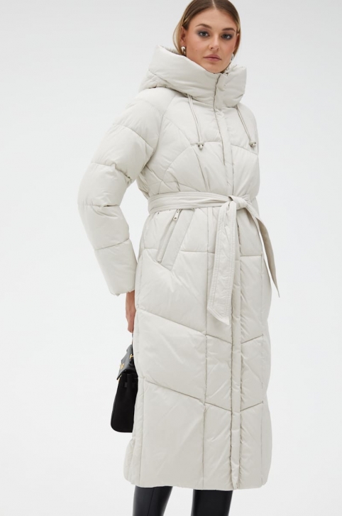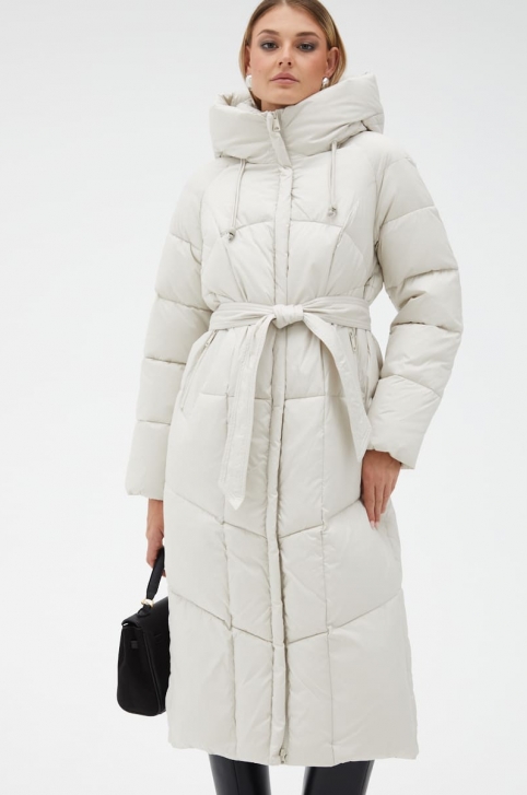 Женский светлый пуховик с капюшоном и поясом - № 31124