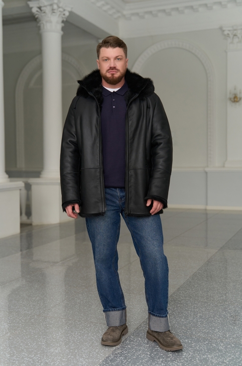 Мужская дубленка черного цвета с капюшоном - № 31792