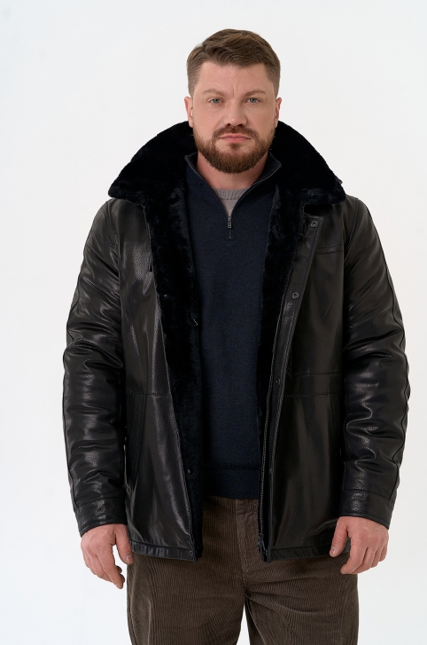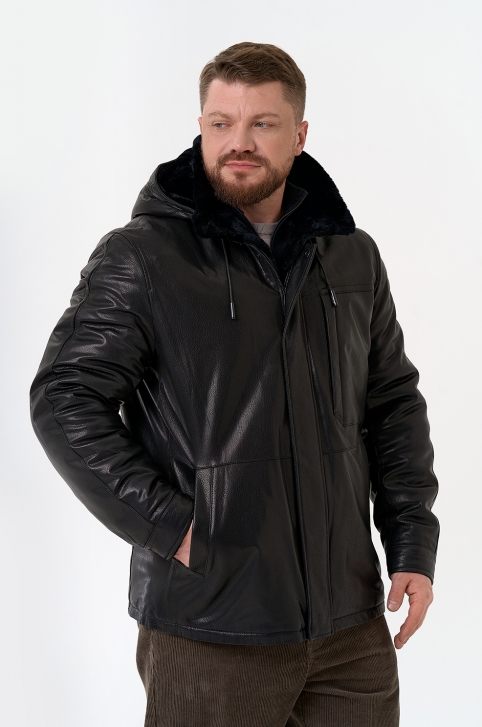 Мужская дубленка черного цвета с капюшоном - № 31776