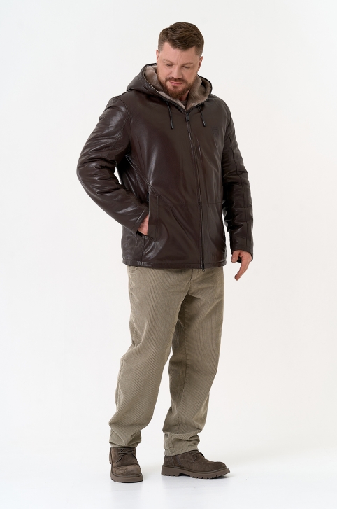 Мужская дубленка коричневого цвета с капюшоном - № 31777