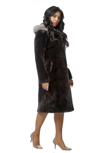 Шуба из мутона с капюшоном, отделка норка - № 8020856