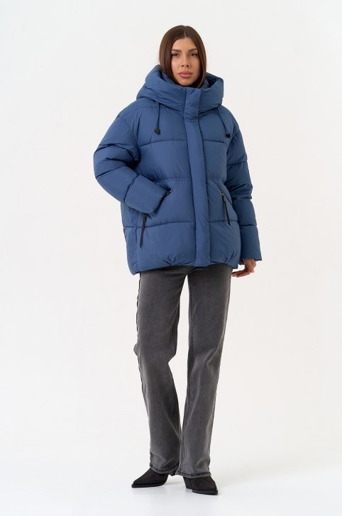 Женский пуховик синего цвета с капюшоном